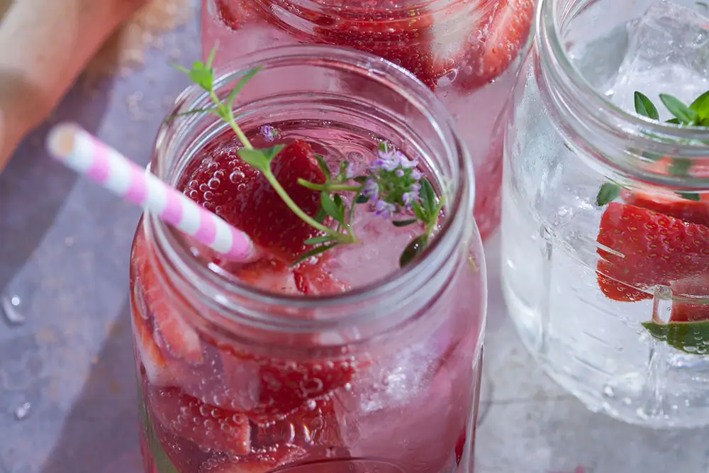& Erdbeeren garnieren. Cheers!