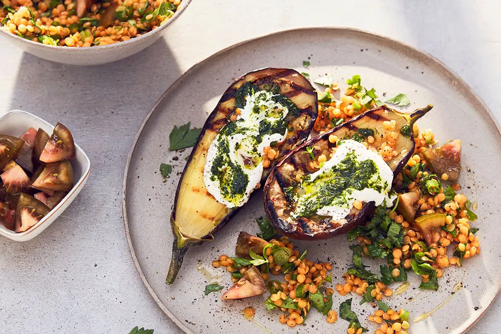 Auberginen halbieren, kreuzweise einschneiden und mit Olivenöl, Honig, Zitrone, Salz & Pfeff er einreiben. Auf dem Grill oder bei 220 °C im Ofen 20–25 Minuten rösten, bis sie weich und leicht gebräunt sind. Sesam drüber. Linsen in wenig Wasser ca. 10–12 Minuten weich kochen, abgießen. Zwiebel, Karotte und Ingwer in Olivenöl anschwitzen, Tomatenmark kurz karamell isieren, Linsen einrühren. Mit Sojasauce, Zitrone, Salz und Pfeff er abschmecken. Auberginen auf Teller, Linsenragout großzügig darüber, mit Kräutern, Tomaten, Zitronenabrieb oder Chili toppen – fertig.