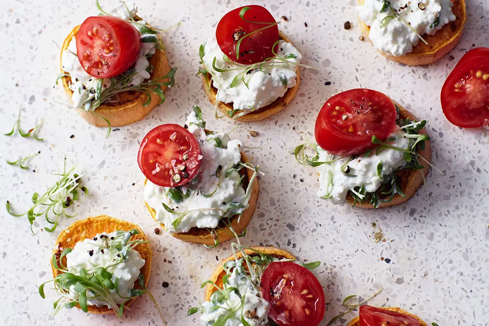 funktioniert wirklich!). Alternativ: 200 °C, 12–15 Min. im Ofen. Körnigen Frischkäse mit Salz, Pfeffer und etwas Olivenöl verrühren, Kräuter unterheben. Tomaten würfeln/halbieren, mit Salz, Pfeff er & Zitrone abschmecken. Süßkartoffel-Toasties mit Frischkäse bestreichen, Tomaten drauf, Kräuter drüber – fertig.